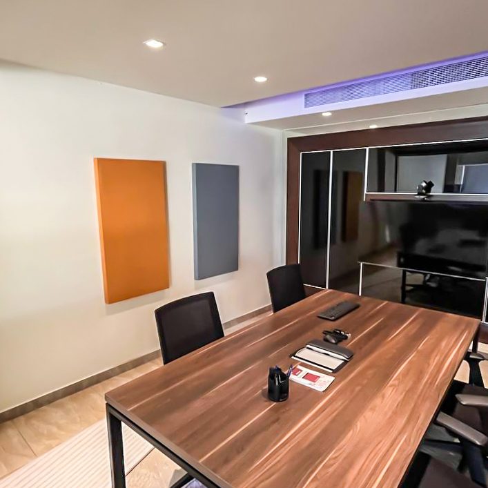 Simple treatment of the meeting room Client: IT Company in Limassol Category: Acoustic Treatment Date: November 2023 Client needed just two acoustic panels on the wall of the meeting room with brand colors. It improved the acoustics of the meeting room by eliminating direct sound reflections.