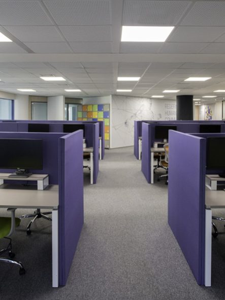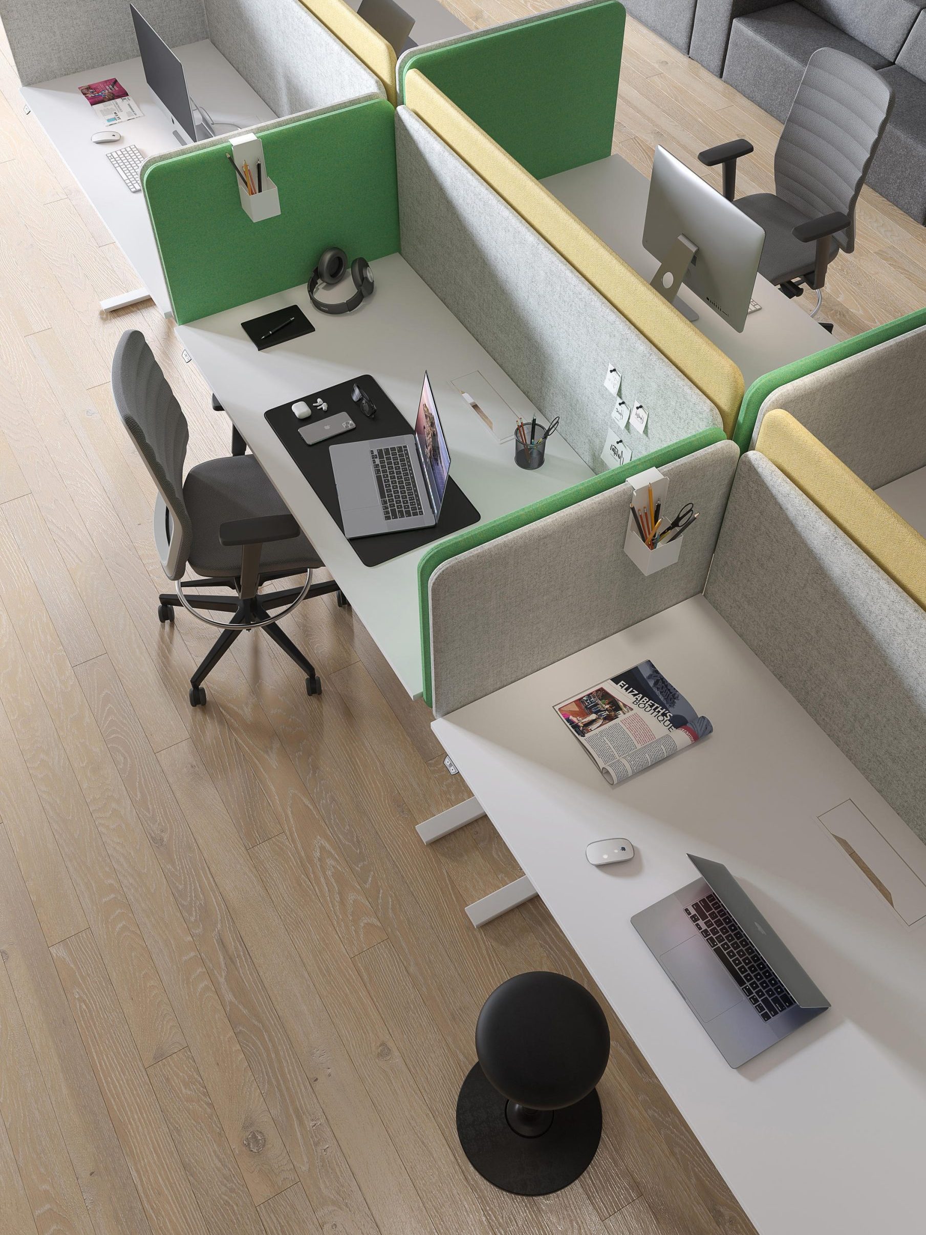 Sound absorbing desk dividers help with visual and acoustic separation of the workspace. The dividers are made of high quality materials using Italian acoustic fabrics finish with a wide selection of colors, whereas the core provides excellent sound absorption.
