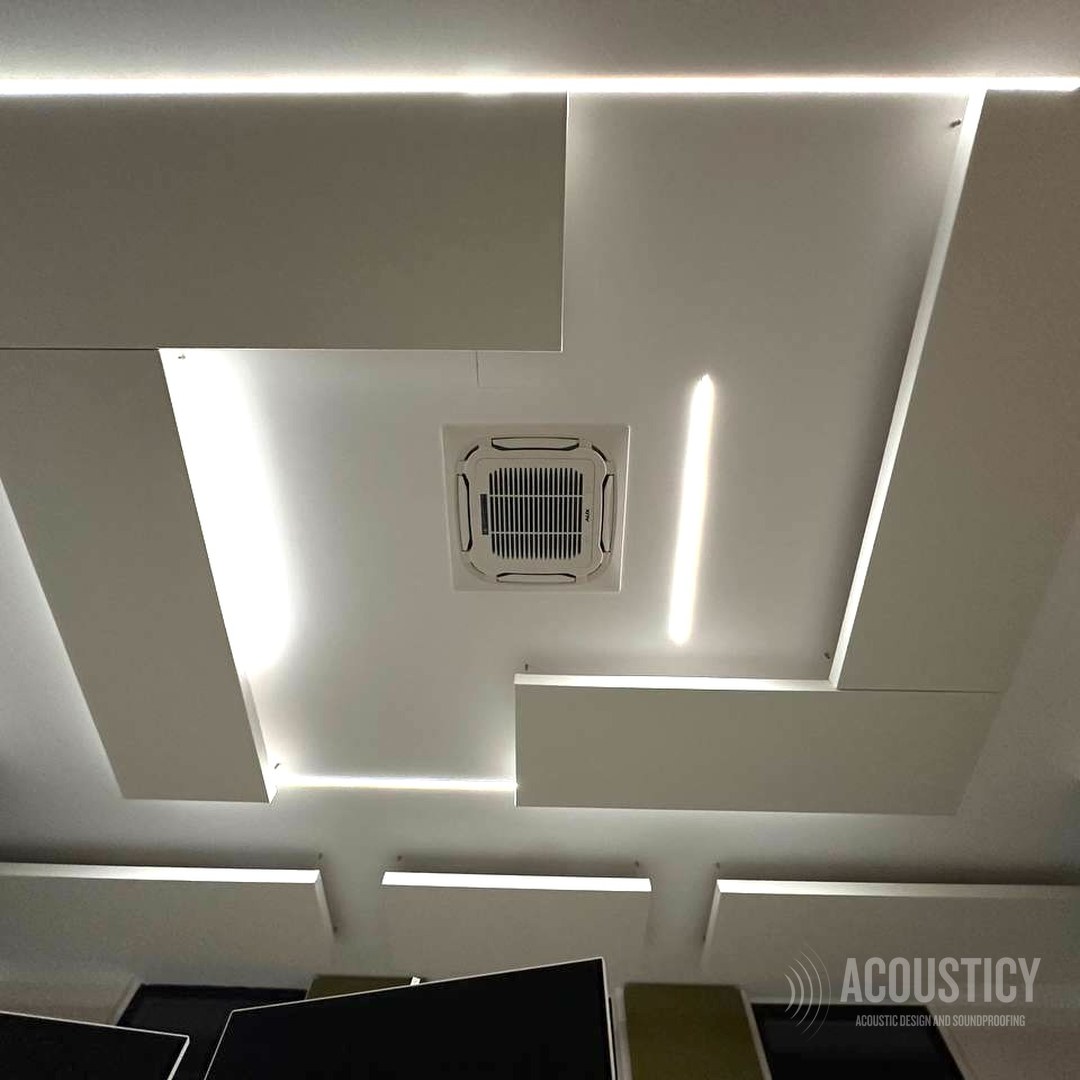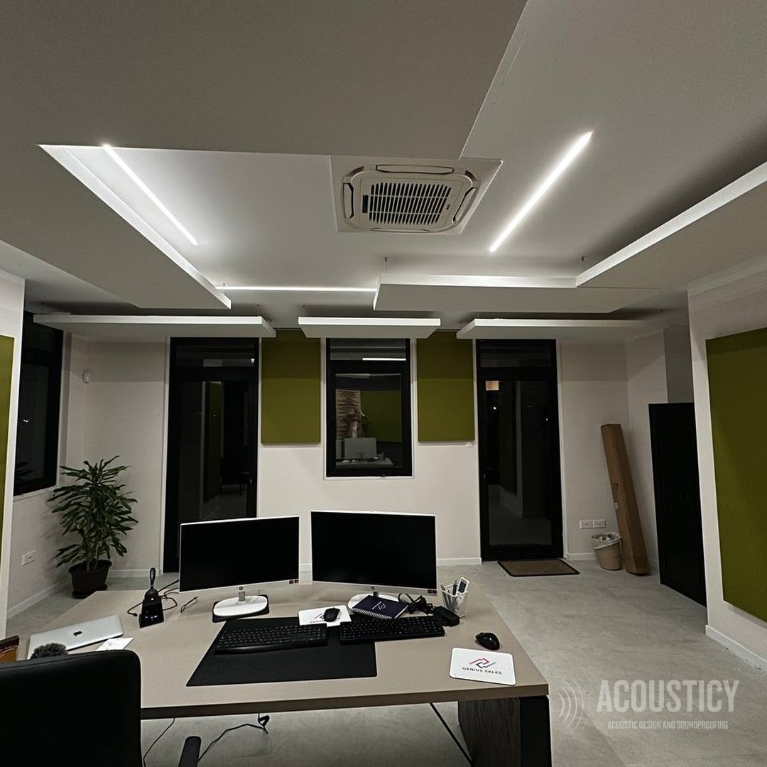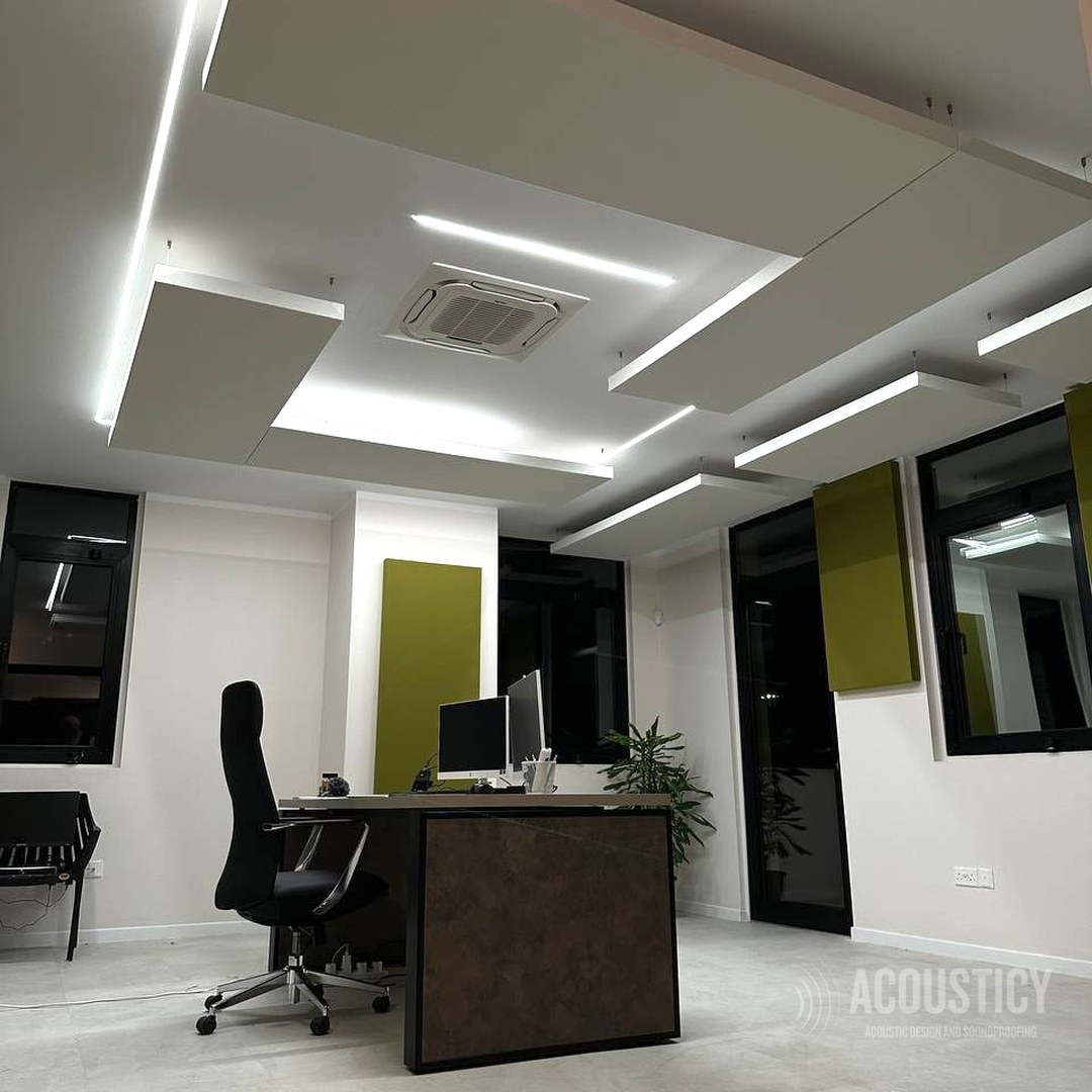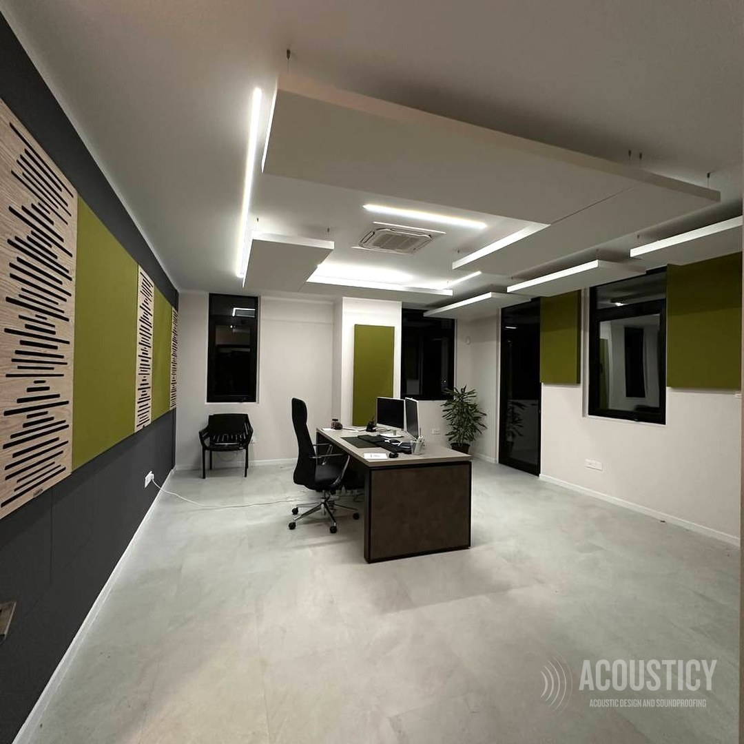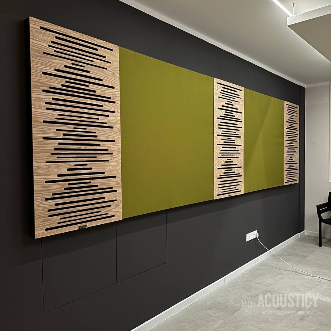 Acoustic treatment of a Larnaca office combining absorbing and diffusing elements as visual design features. Oak wood acoustic diffusers paired with olive fabric absorber panels on a dark accent wall, complemented by suspended ceiling panels with integrated LED lighting and wall-mounted absorbers throughout the space — all designed to deliver both acoustic performance and a striking interior aesthetic.