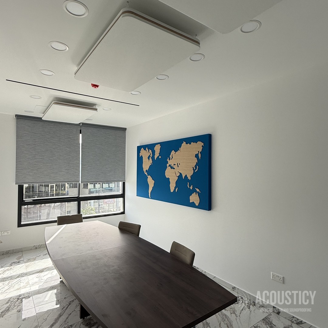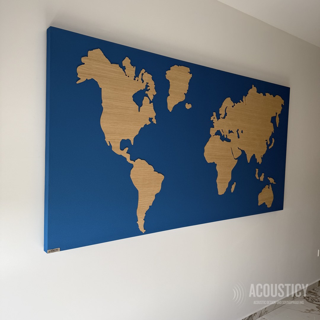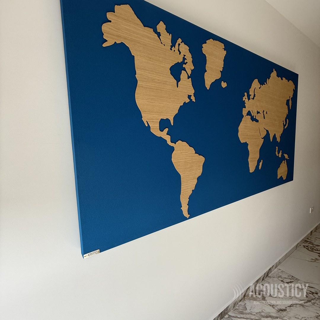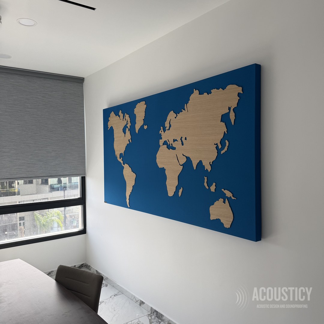 A bespoke world map acoustic panel with oak-veneer continents on deep blue fabric, paired with Premium ceiling acoustic panels. Installed in a glass-partitioned meeting room to dramatically reduce reverberation time (RT60), combining striking visual design with high-performance sound absorption.