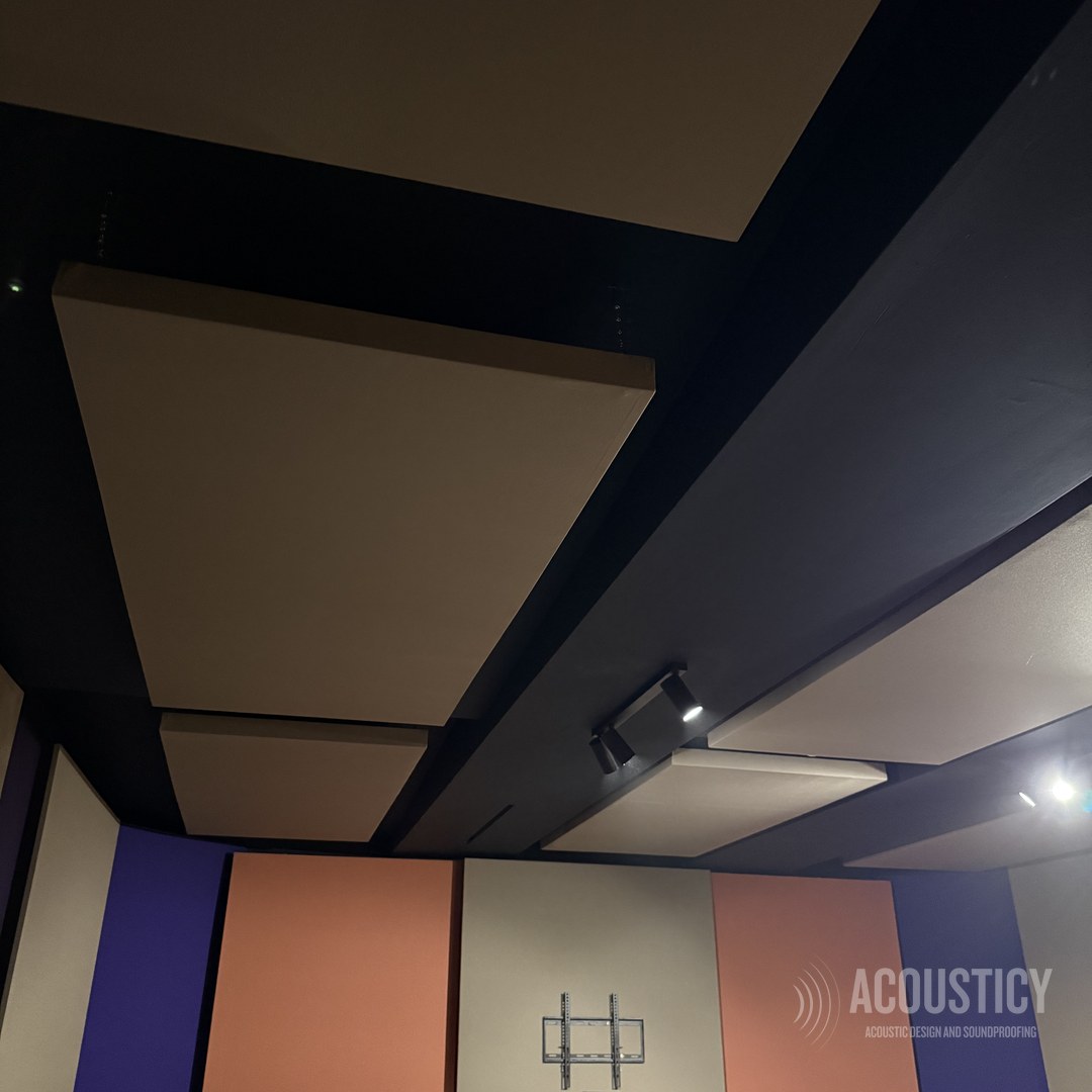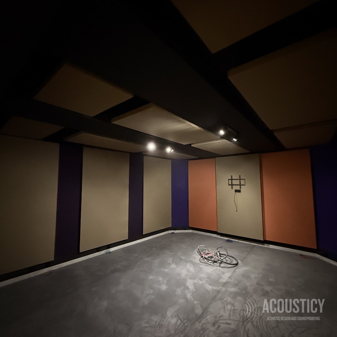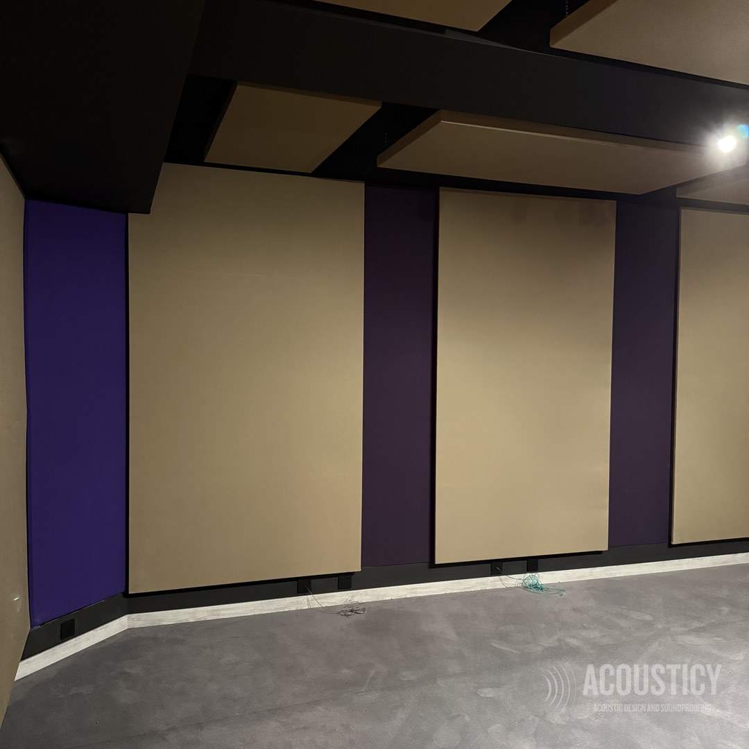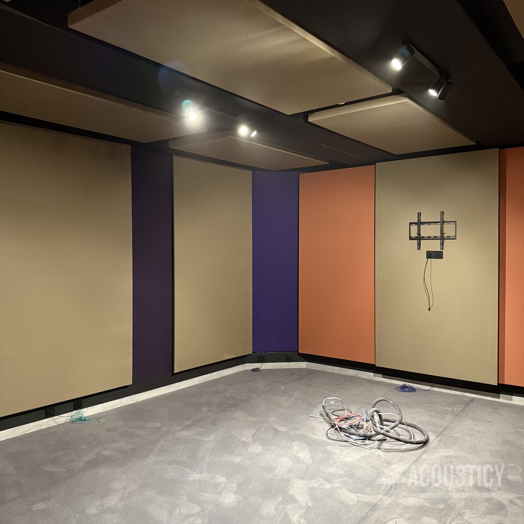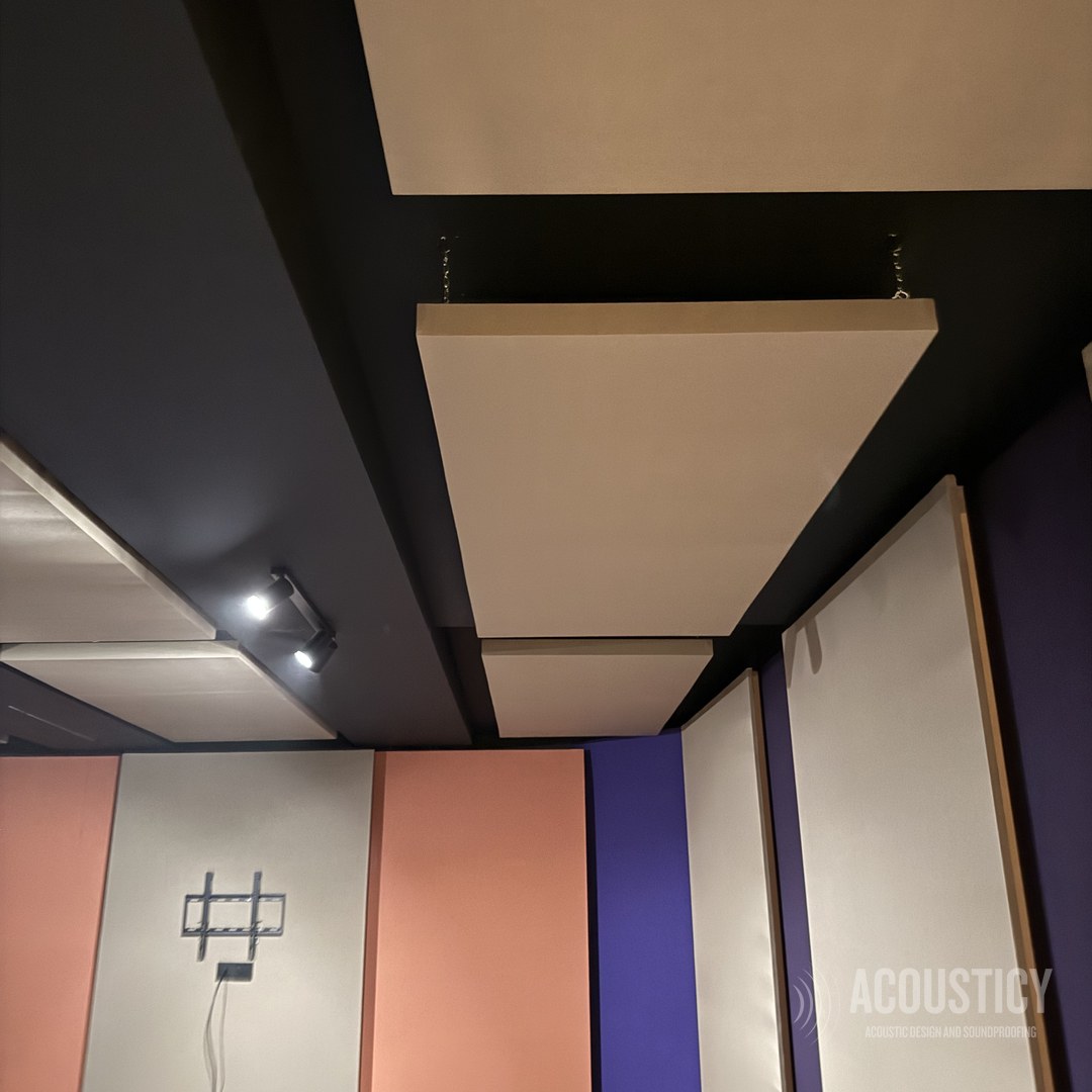 A complete Dolby production studio designed and built in the BEON office basement in Paphos for OwlCat game developer. Full wall-to-wall acoustic treatment with color-coded fabric panels in beige, orange, and purple, suspended ceiling clouds in black framework, and Genelec monitoring — all engineered according to acoustic calculations for professional sound design and production work.
