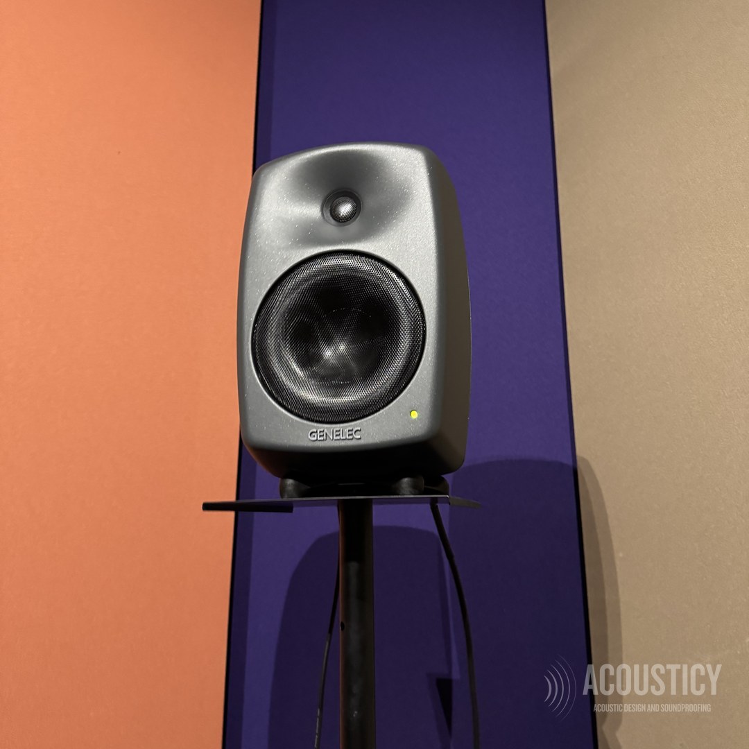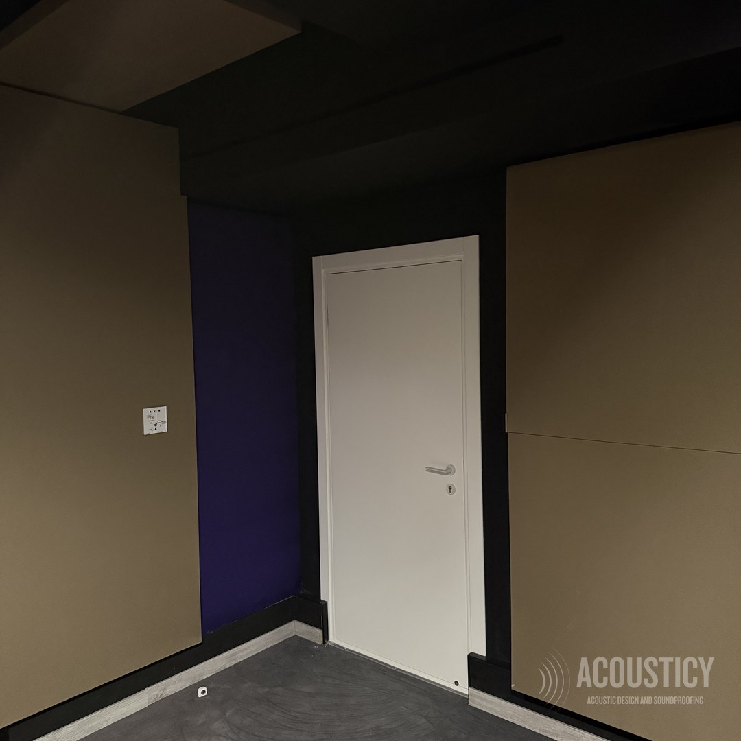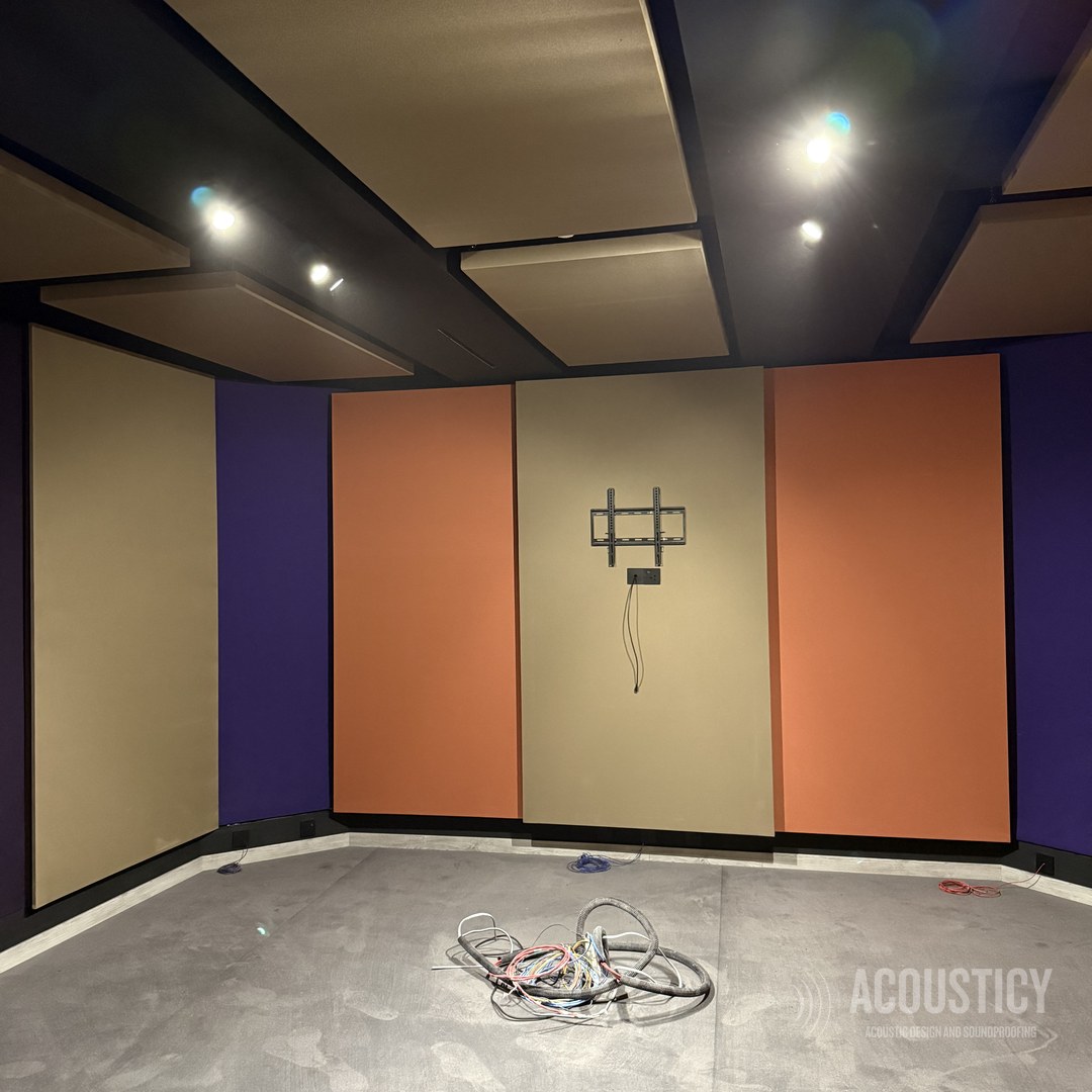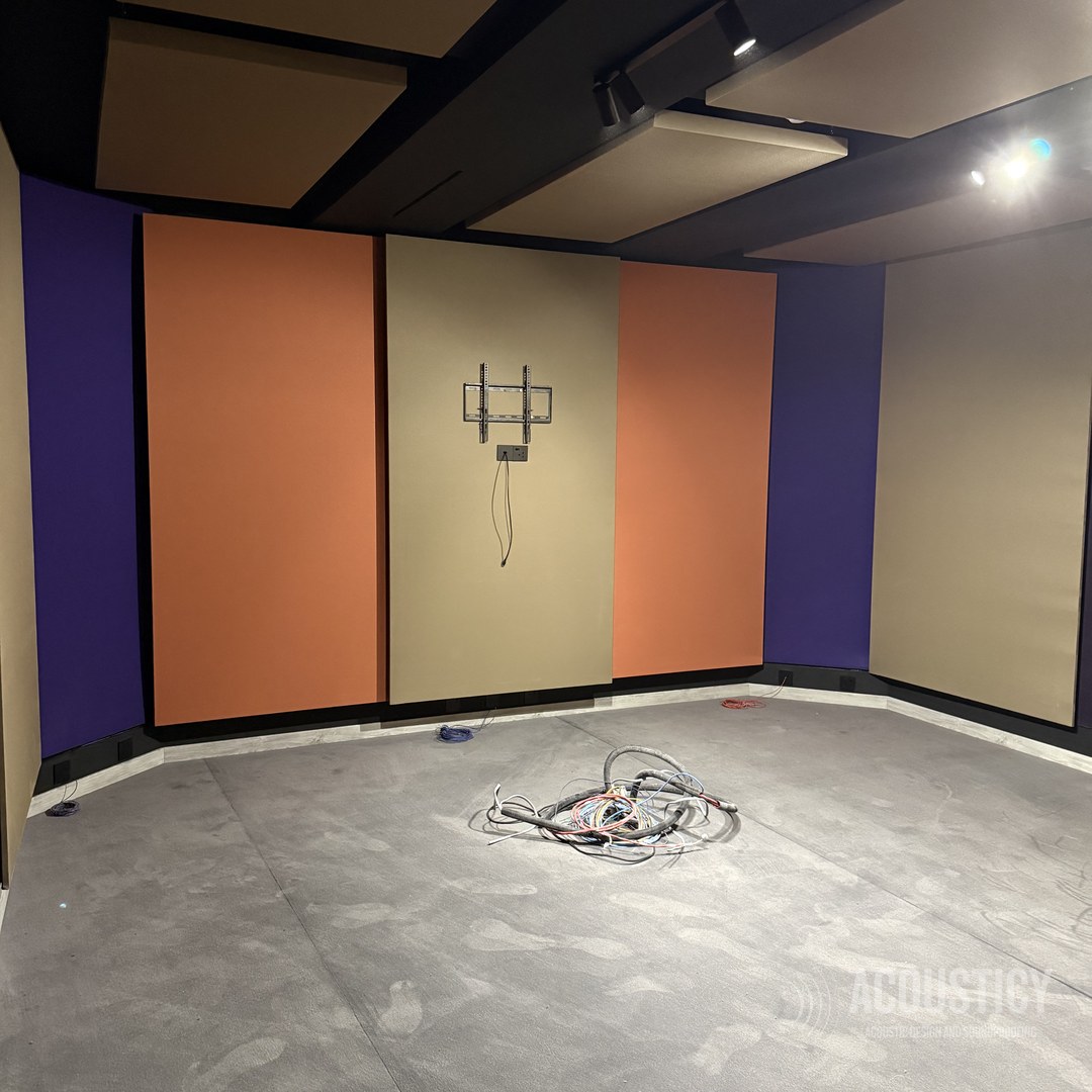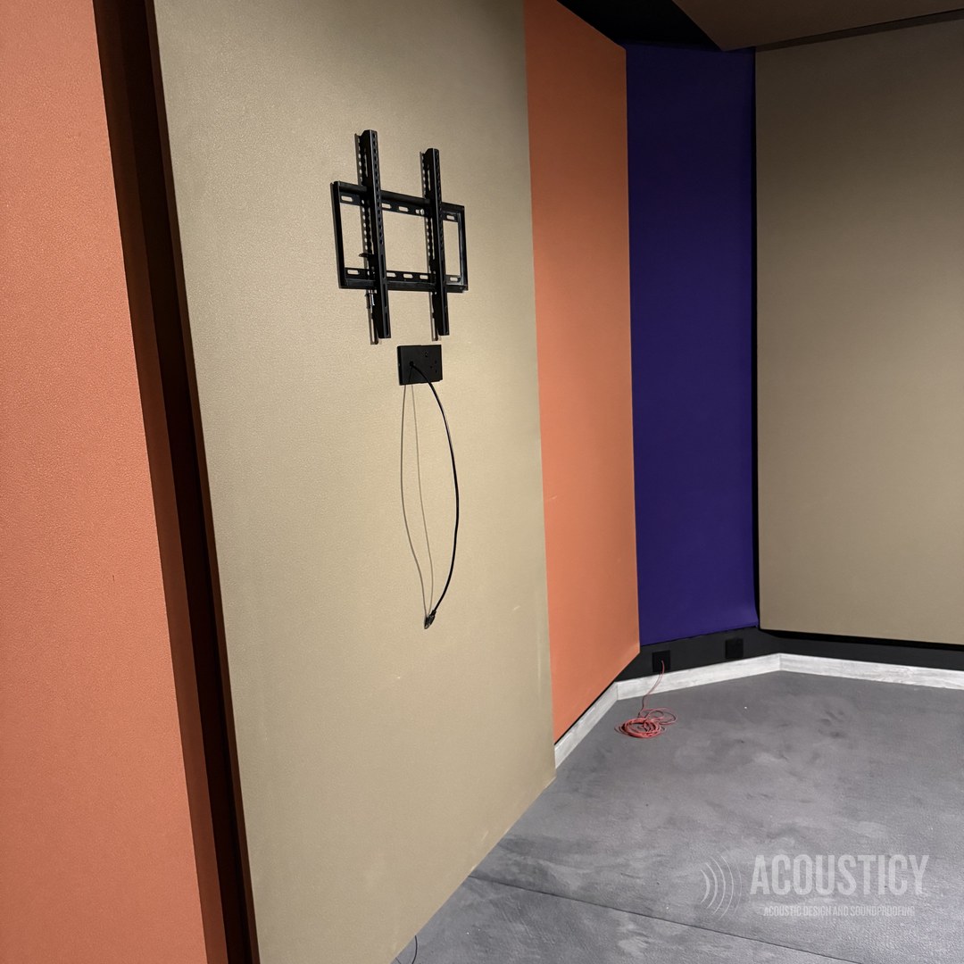 A complete Dolby production studio designed and built in the BEON office basement in Paphos for OwlCat game developer. Full wall-to-wall acoustic treatment with color-coded fabric panels in beige, orange, and purple, suspended ceiling clouds in black framework, and Genelec monitoring — all engineered according to acoustic calculations for professional sound design and production work.