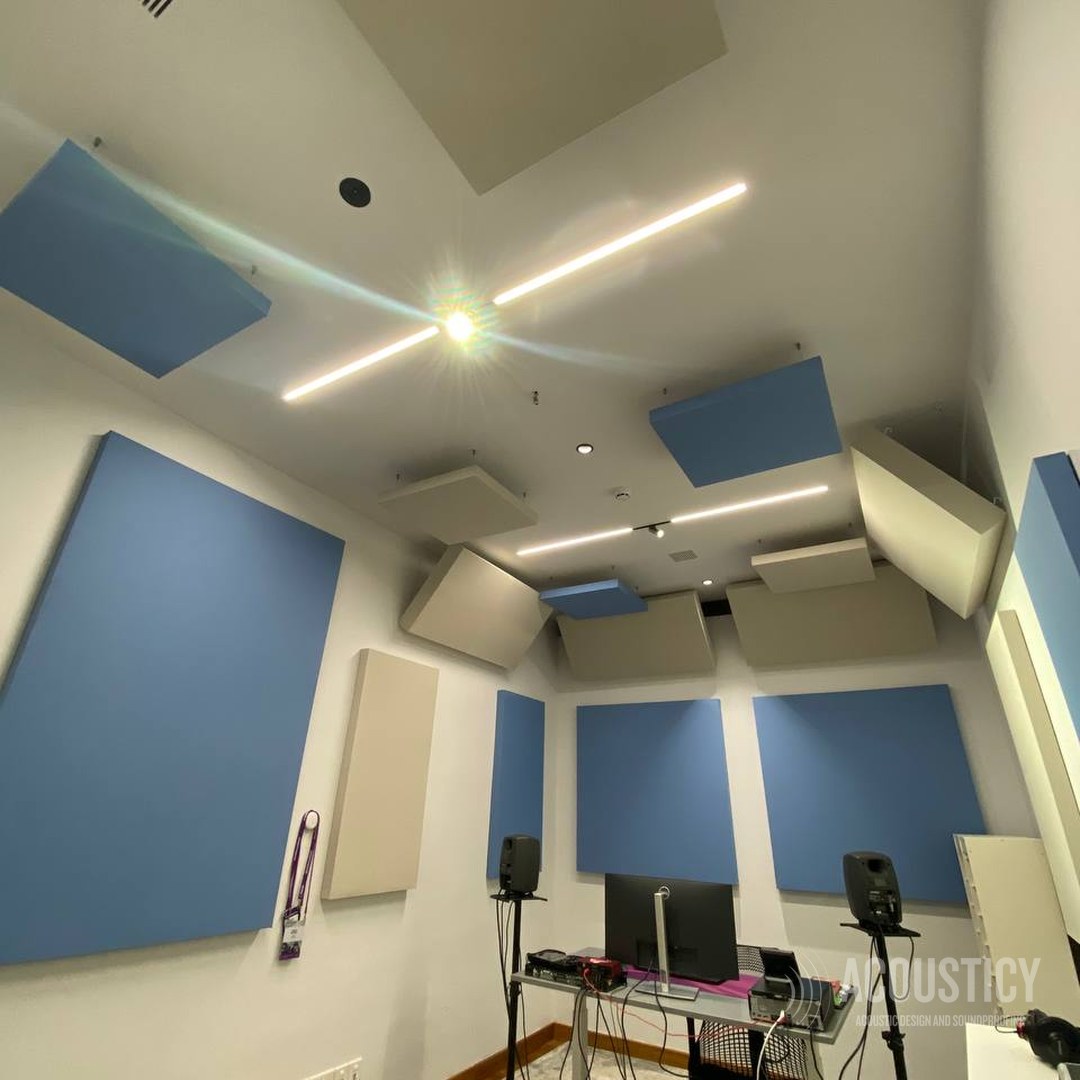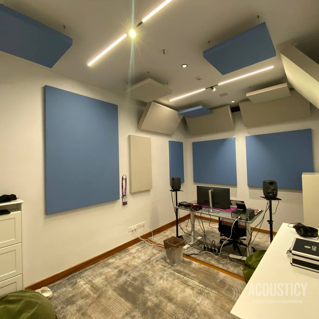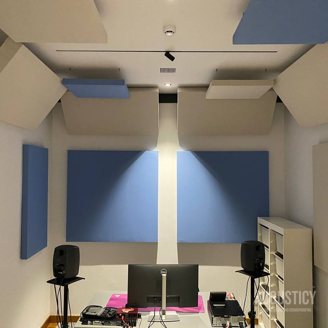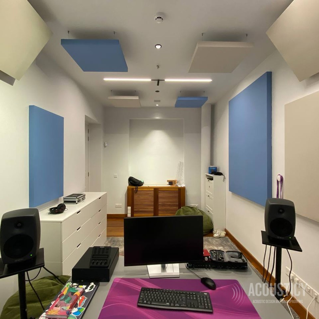 Acoustic treatment of a game development sound design room, optimized for critical listening at the mix position. Panels placed at first reflection points on walls and ceiling, with corner bass traps for low-end control — all calculated and positioned according to acoustic analysis to ensure accurate monitoring for production and sound design work.