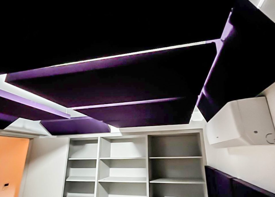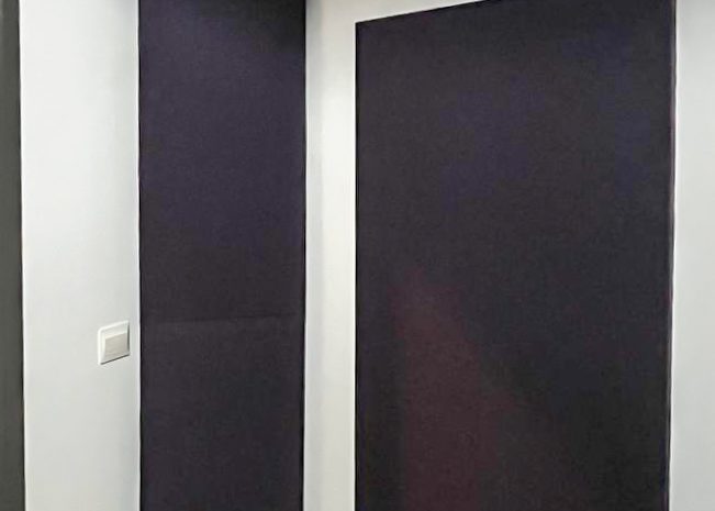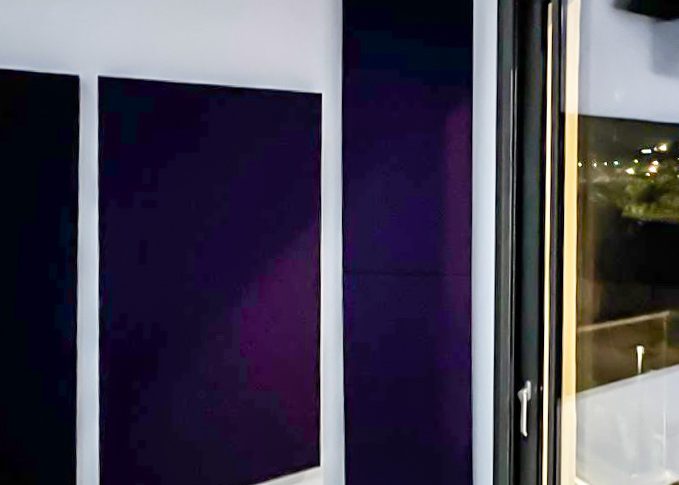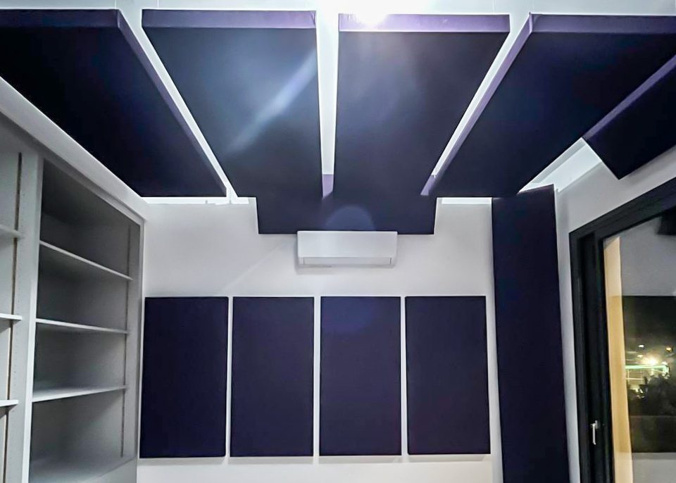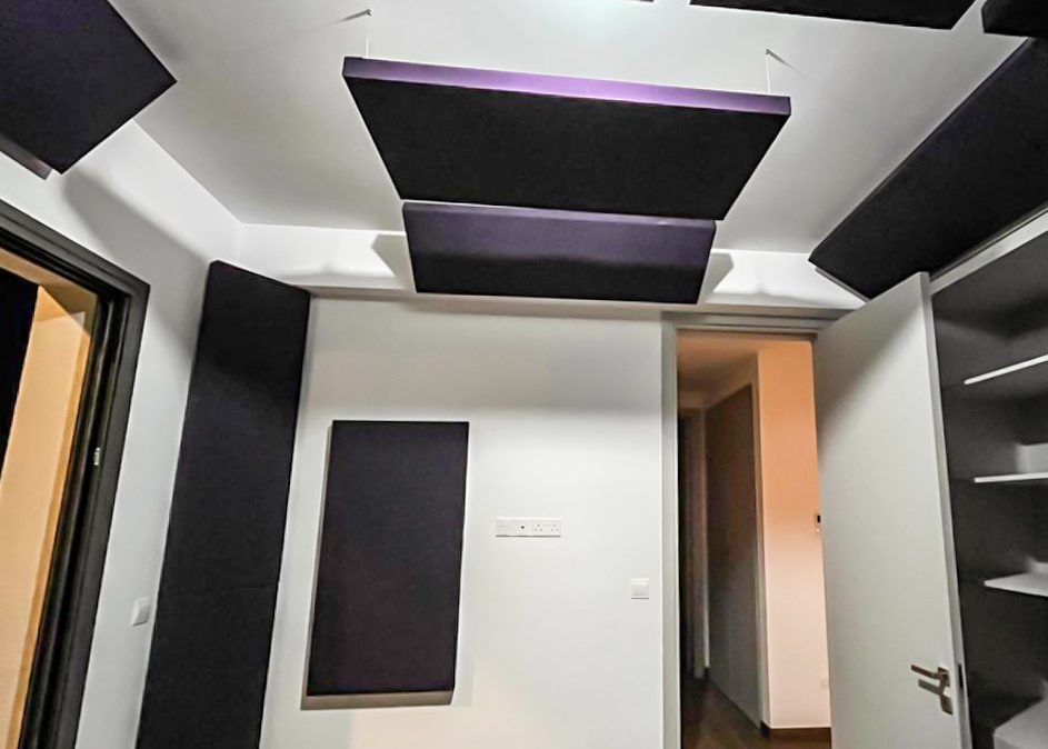 New aparment empty room had to be converted into a music production room. The use of acoustic panels on walls and ceiling was suggested, as well as corner bass traps and free standing panels to eliminate the sound reflection from the window.